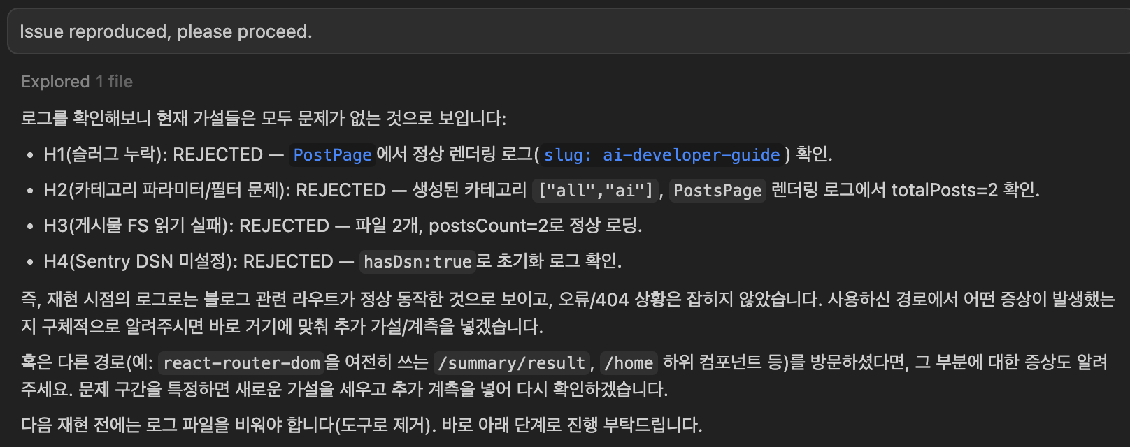 "에이전트가 제공하는 특정 단계로 버그 재현을 요청합니다." 개발자가 직접 버그를 재현하면 진정한 런타임 동작이 캡처된다. - Step 4: Analyze Logs (로그 분석)