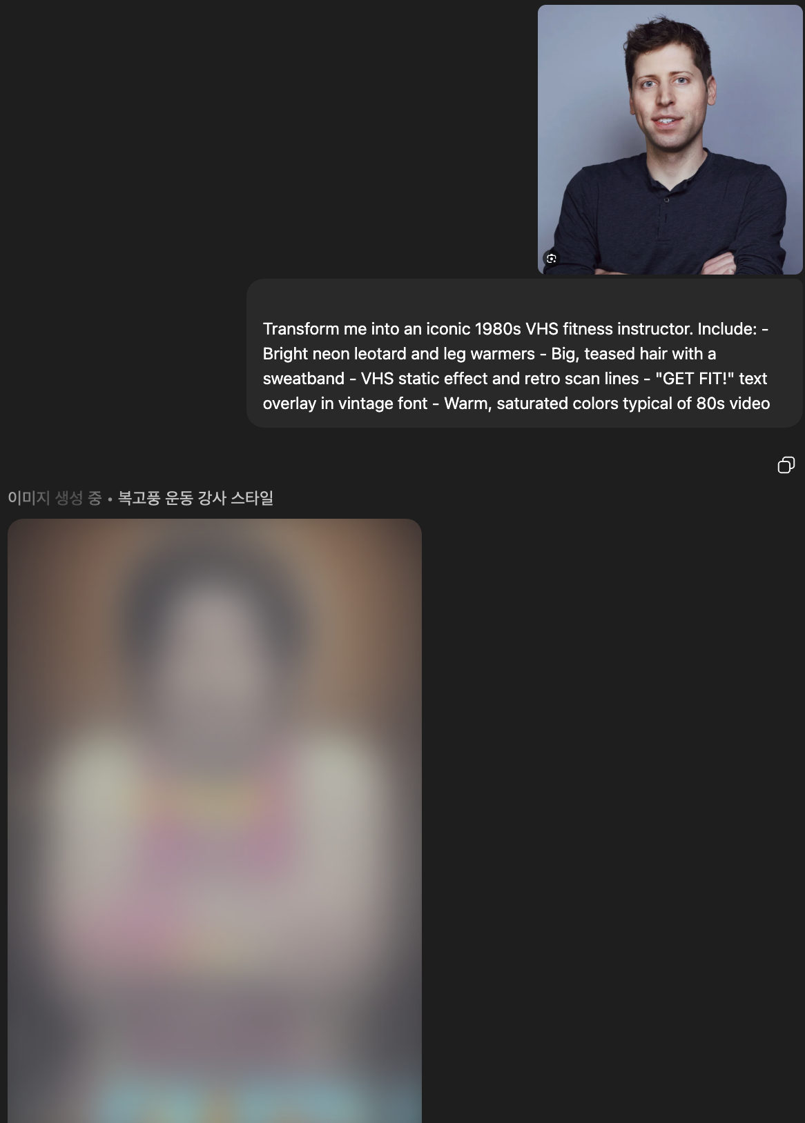 기존 사진을 특정 스타일로 변환하는 예시다. OpenAI가 공식 데모에서 샘 올트먼 CEO의 사진을 1980년대 VHS 피트니스 강사 스타일로 변환한 것이 화제가 되었다.