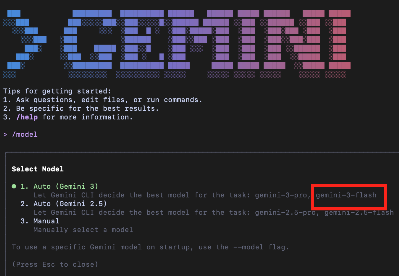 /model명령어로 Gemini 3 Flash를 선택하면 된다