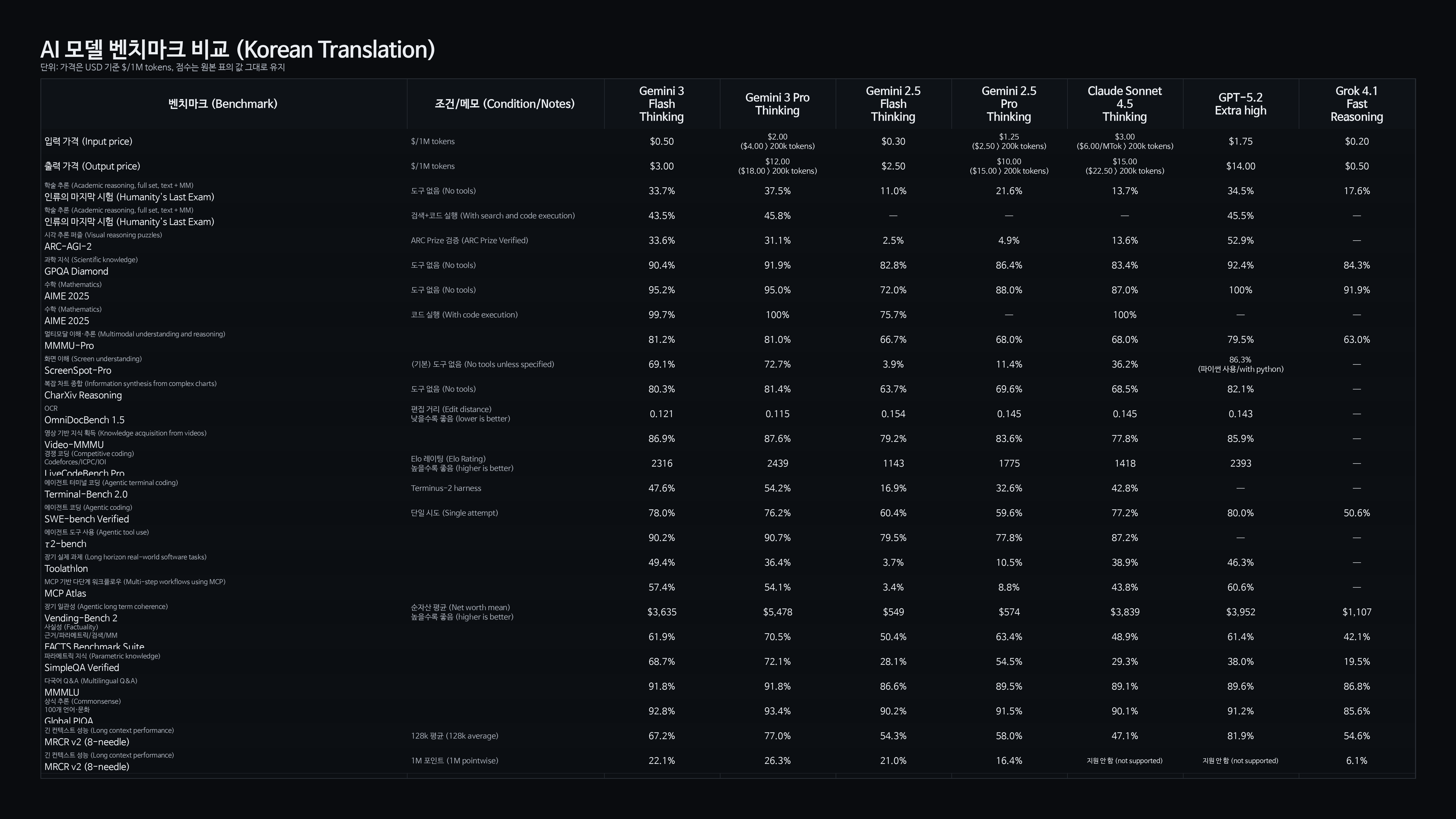 | 벤치마크 | Gemini 3 Flash | Gemini 3 Pro | Claude Sonnet 4.5 | GPT-5.2 | Grok 4.1 |