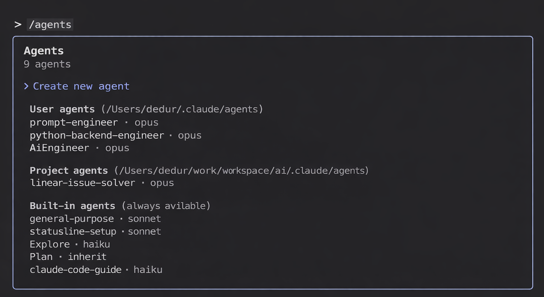 서브에이전트는 복잡한 작업을 분업화하여 처리할 수 있게 해준다. /agents 명령으로 사용 가능한 서브에이전트 목록을 확인할 수 있다.