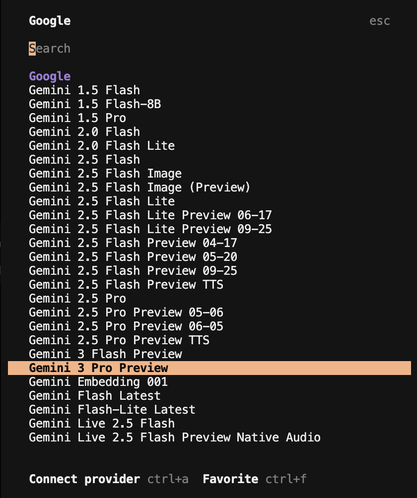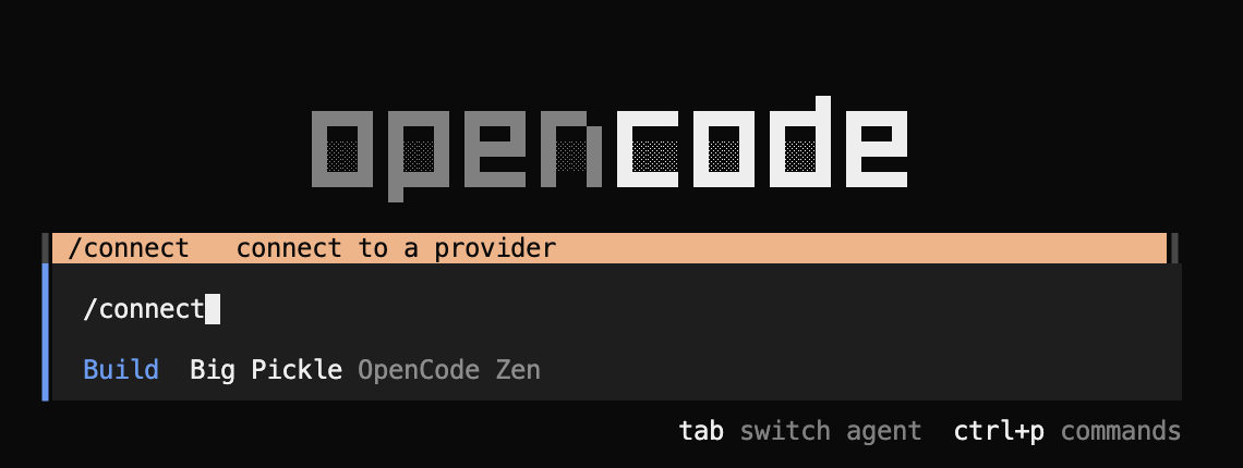 가장 쉬운 방법은 /connect 명령을 사용하는 것이다. OpenCode를 실행한 후 이 명령을 입력하면 대화형으로 LLM 제공자를 선택하고 API 키를 입력할 수 있다.
