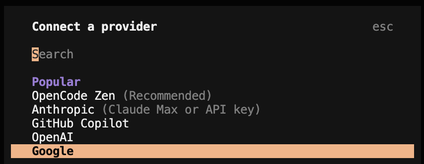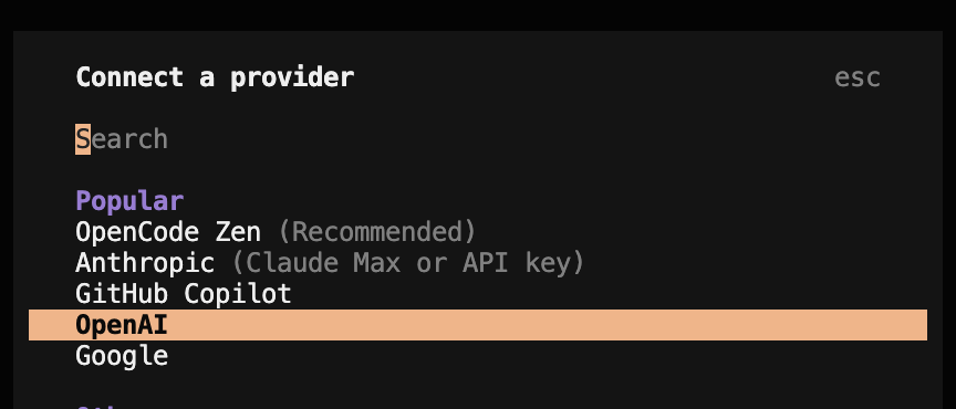 OpenCode를 사용하려면 먼저 LLM(Large Language Model) 제공자를 연결해야 한다. OpenCode는 75개 이상의 LLM 제공자를 지원하므로, 원하는 서비스를 선택할 수 있다.