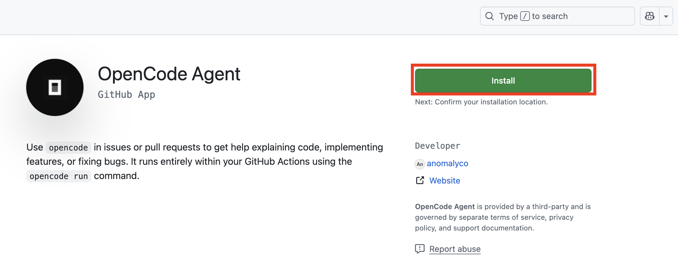 GitHub 연동을 위해서는 먼저 OpenCode GitHub 앱을 설치해야 한다. 터미널에서 다음 명령어를 실행하면 브라우저가 열리고 GitHub 앱 설치 페이지로 이동한다.