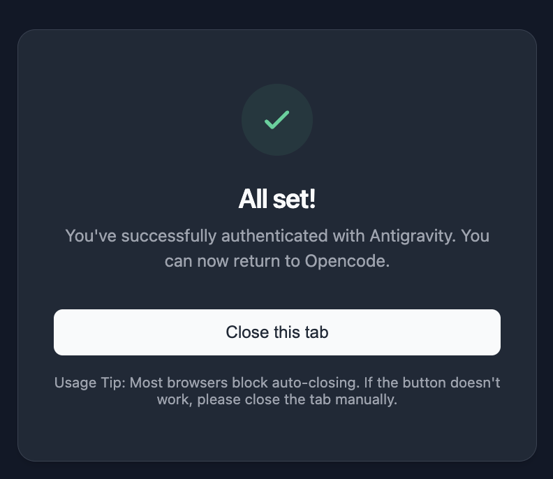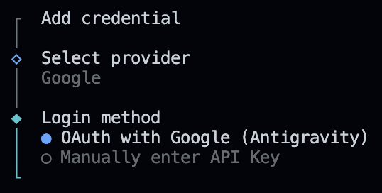해결: opencode.json에서 opencode-antigravity-auth 플러그인을 제거하고 표준 Google OAuth를 사용한다.