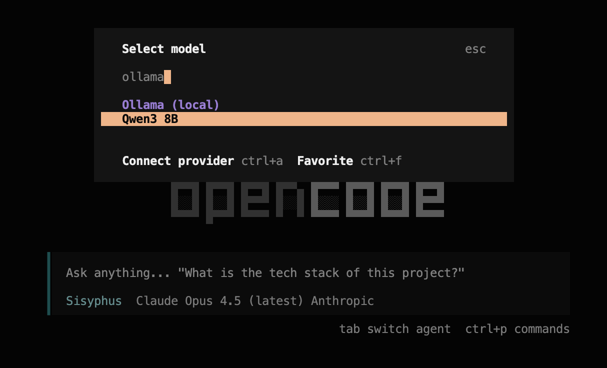 - opencode.json: 위의 순정 설정과 동일하게 커스텀 provider 정의 (Ollama 등)