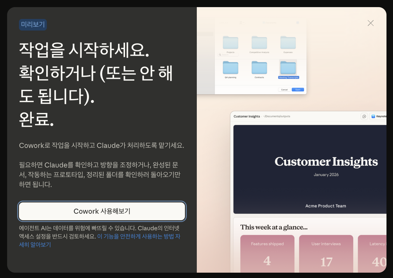 - 최초에 사용하는 경우라면 다음과 같이 신기능인 Cowork에 대해 안내 팝업이 뜬다.