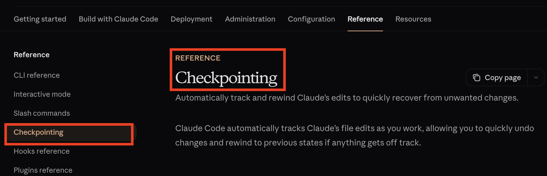 Claude Code Docs 공식 문서 >> [참고자료(Reference)] 섹션의 내용 중 [체크 포인팅(checkpointing)]를 살펴 보려고 합니다.