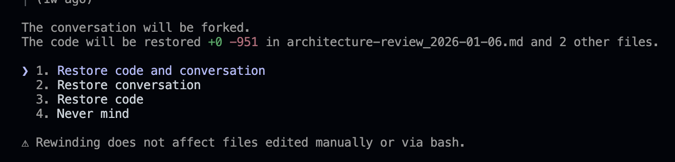 Claude가 bash 명령어를 사용해서 파일을 변경한 경우, 체크포인팅에 포함되지 않는다.