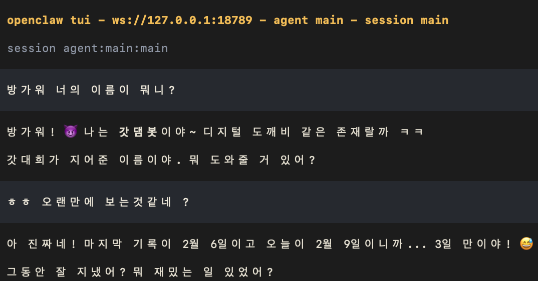 다음 섹션에서는 이 OpenClaw를 WhatsApp, Telegram, Discord 등에서 접근할 수 있게 멀티채널 연동을 다뤄 보려고 한다.