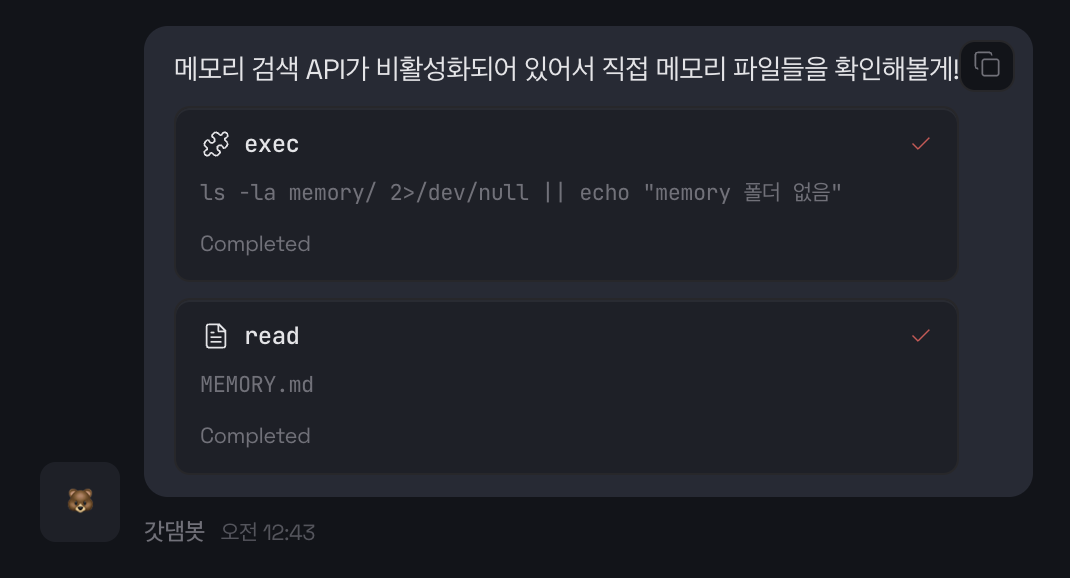 | 예전 기록을 못 찾음 | 오늘/어제만 자동 로드됨, memory_search 도구 사용 |