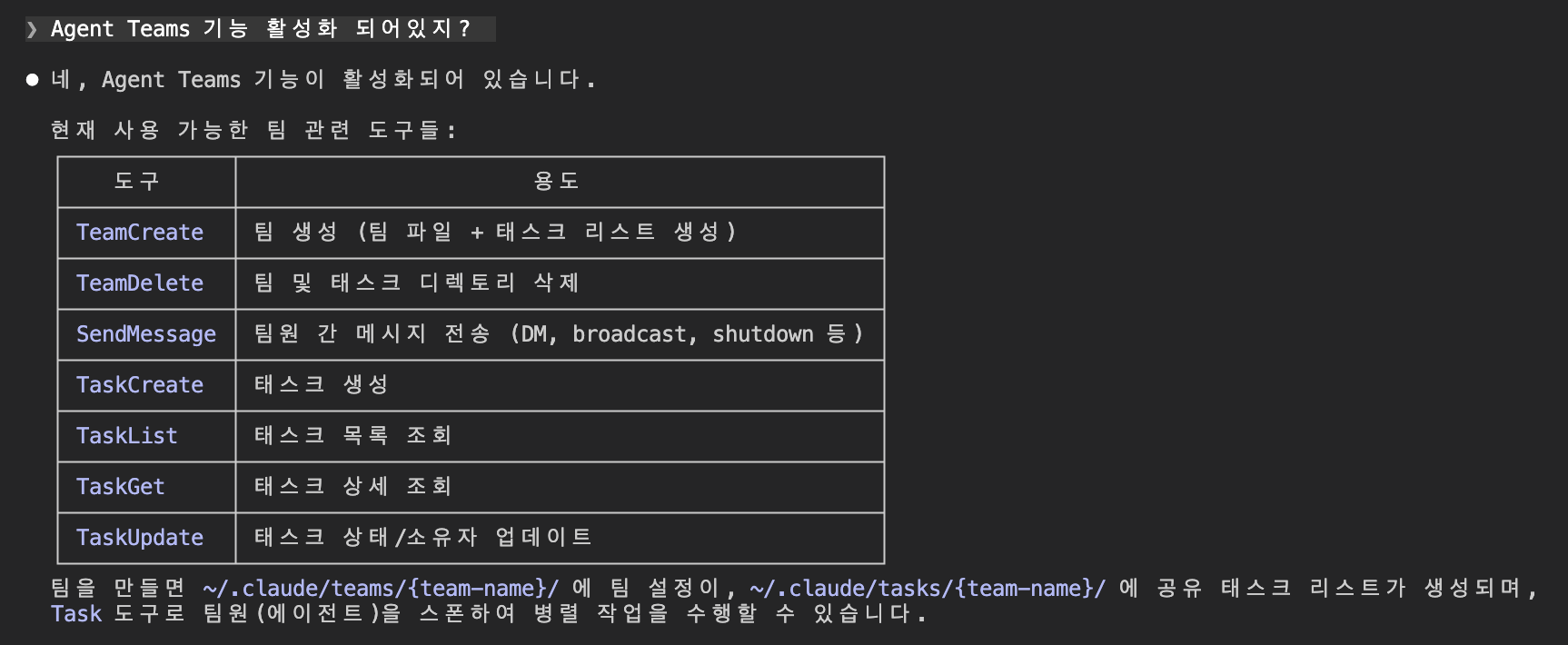 - Agent Teams: 코딩 도구 안에서 네이티브로 동작한다. 별도 프레임워크 설치나 설정 없이 Claude Code 내에서 바로 사용 가능