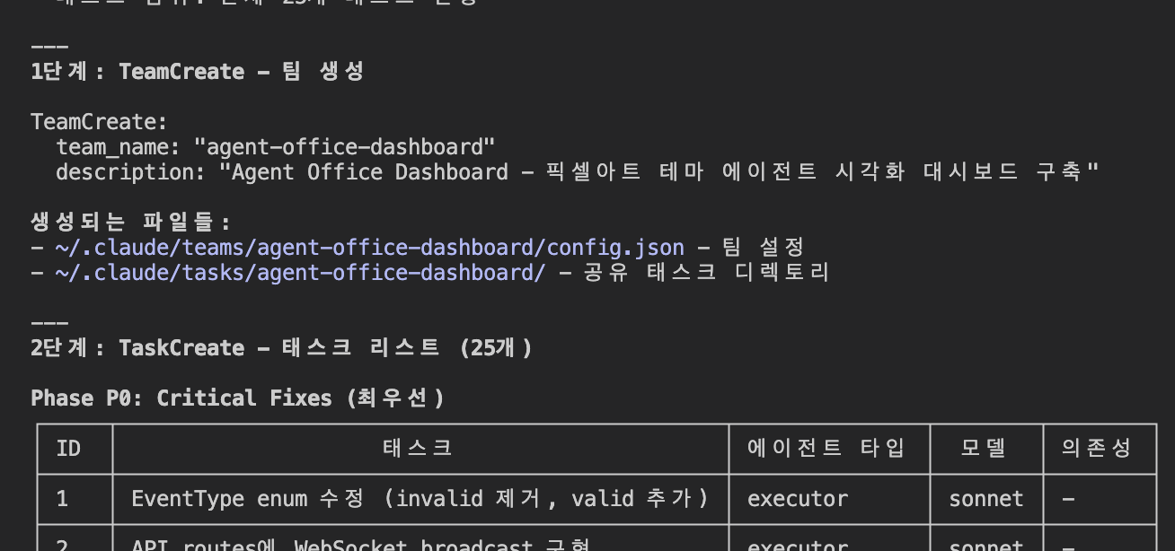 config.json에는members배열이 포함되며, 각 팀원의 이름(name), 에이전트 ID(agent ID), 에이전트 타입(agent type)이 기록된다. 팀원들은 이 파일을 읽어 다른 팀원을 발견할 수 있다. - 태스크 목록: