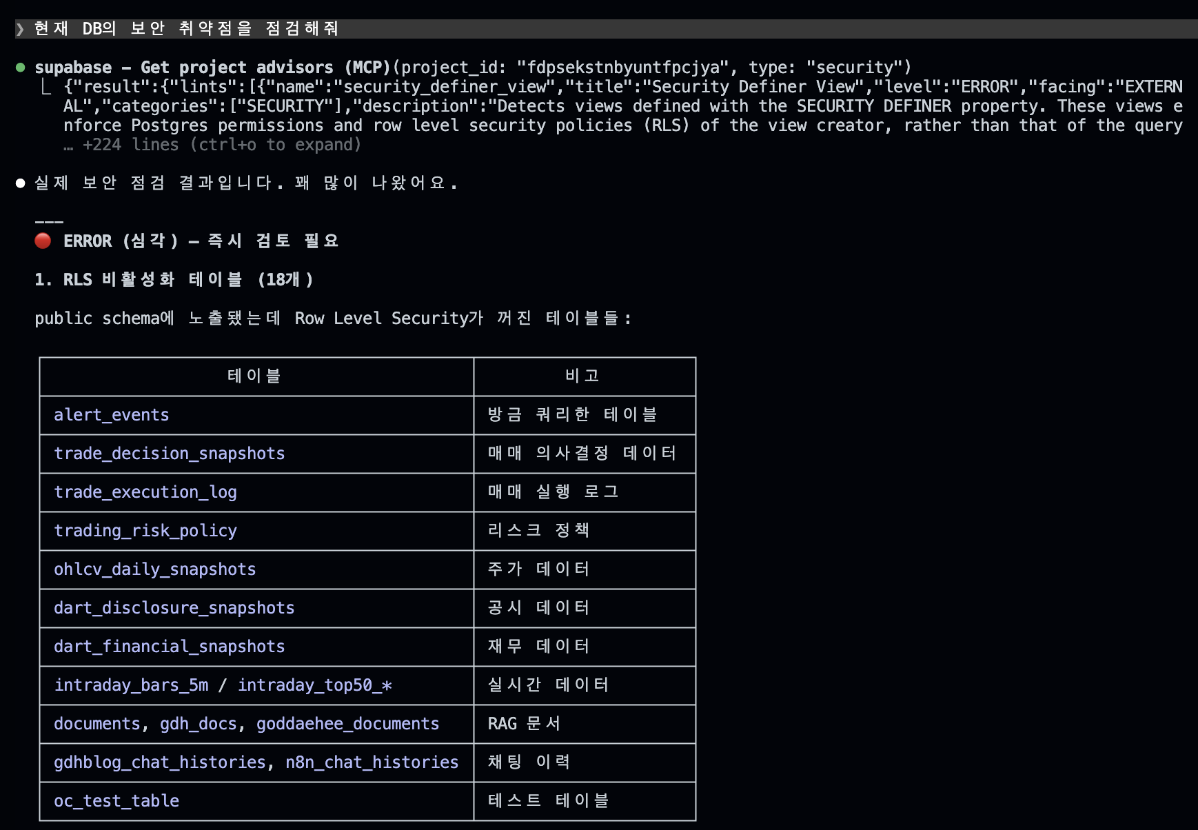 supabase inspect db 실제 출력아래는 실제 프로젝트(rag project)에서