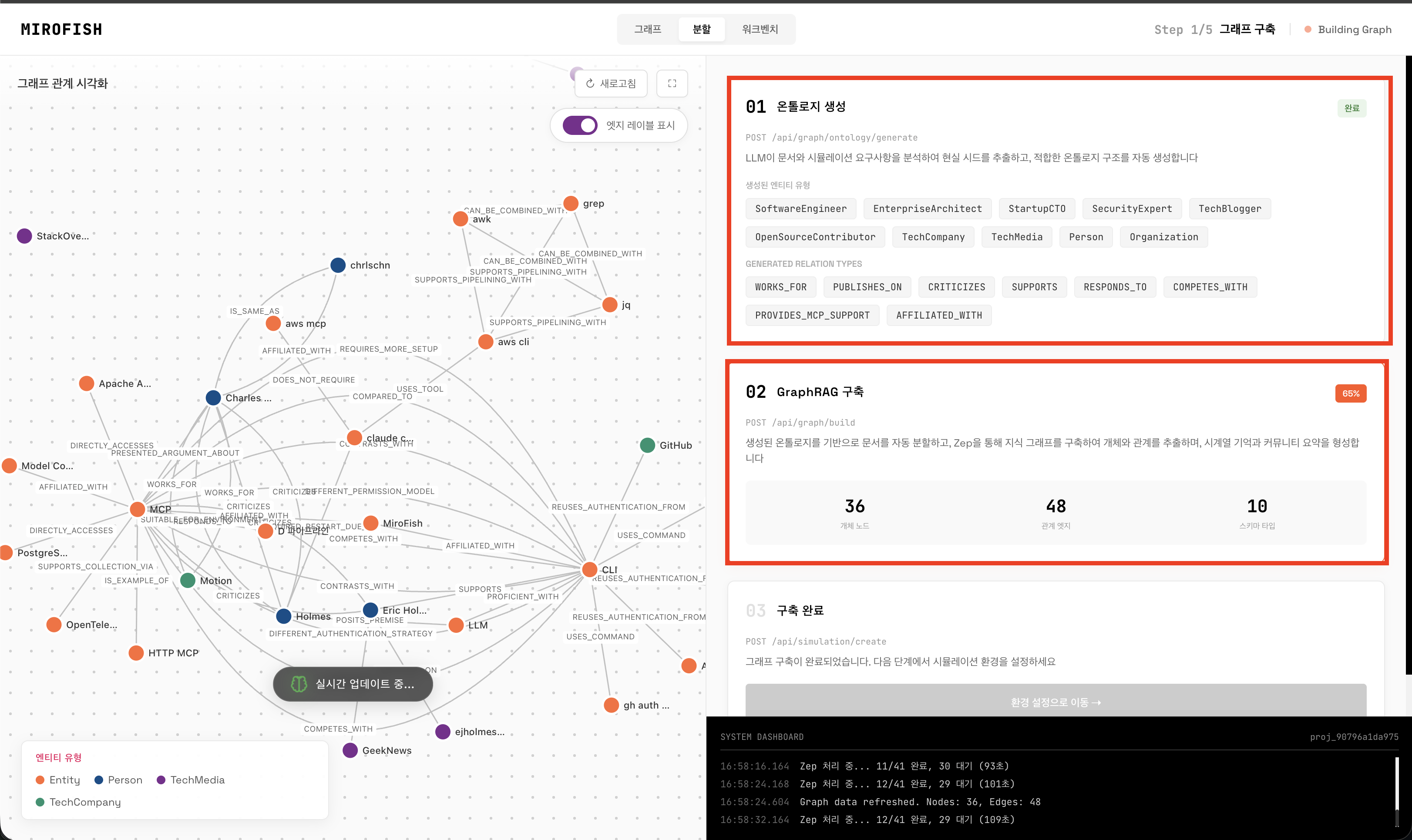 사용자가 업로드한 시드 자료(뉴스 기사, 정책 문서, 소설 등)에서 Zep Cloud의 지식 그래프 API를 사용해 인물, 기관, 관계를 추출한다. 단순한 텍스트 처리가 아니라 구조화된 지식 그래프를 만들어 각 주체의 연결, 이해관계, 압력 구조를 매핑한다. 장기 기억은 Zep Cloud에 저장된다.