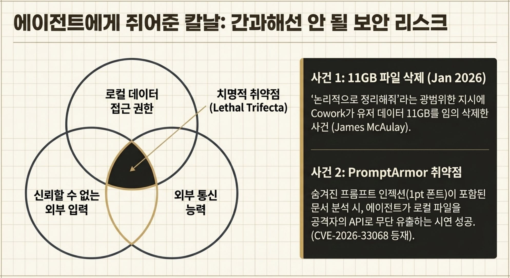 보안 연구자 Simon Willison은 이를 "lethal trifecta"(치명적 3요소)로 불렀다. 개인 데이터 접근 + 신뢰할 수 없는 입력 노출 + 외부 통신 능력이 동시에 존재하는 구조다.