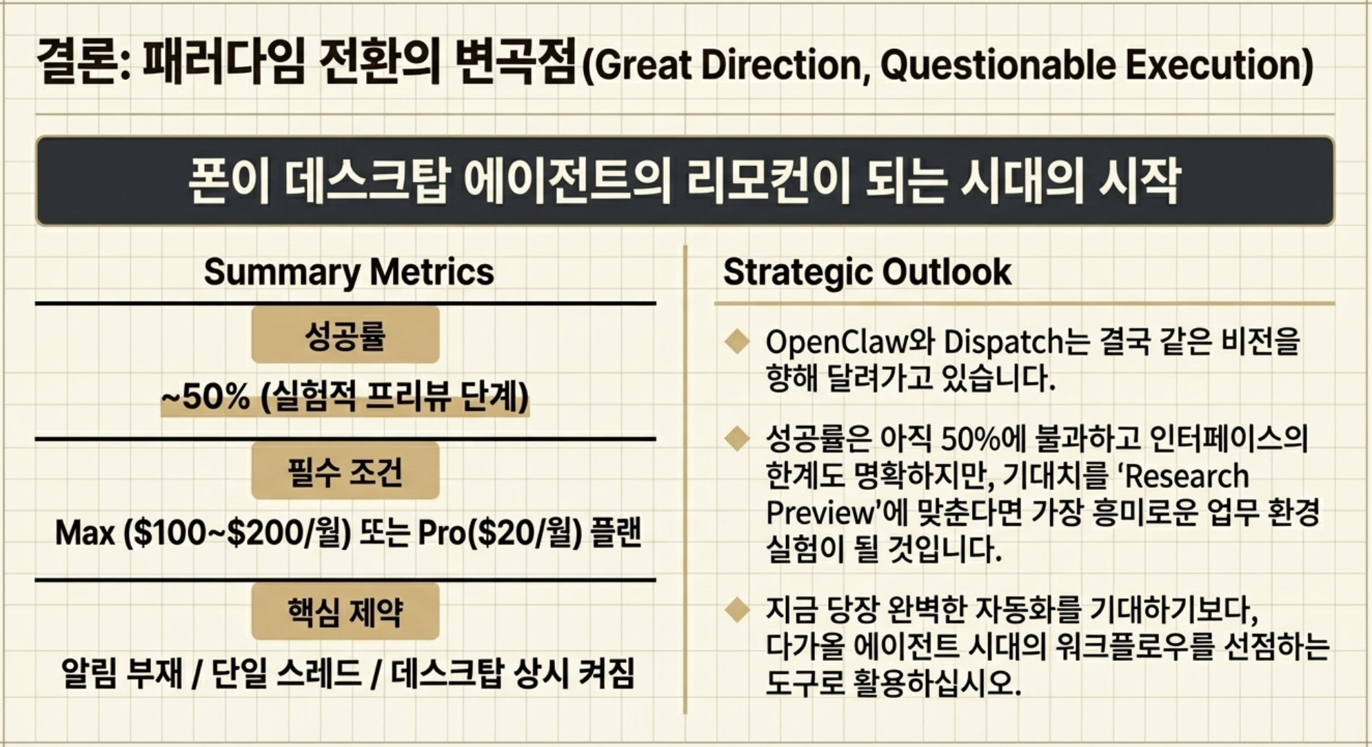그래도 방향은 뚜렷하다. 폰이 데스크탑 에이전트의 리모컨이 되는 것. OpenClaw든 Dispatch든 이 흐름을 향한다.