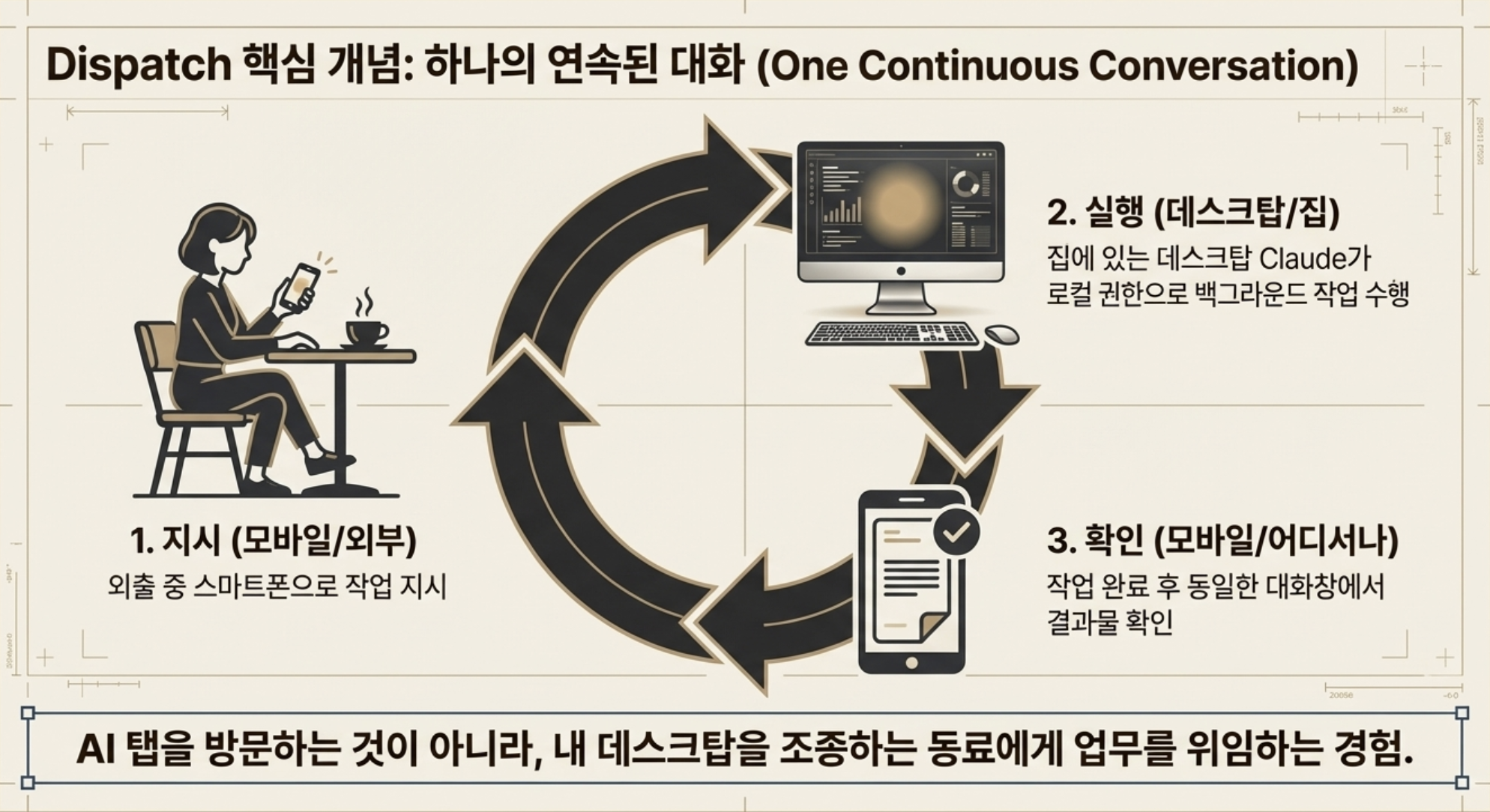 Dispatch는 간단히 말하면 폰으로 집 컴퓨터의 Claude에게 일을 시키는 기능이다. 외출 중에 스마트폰으로 "이 파일 분석해서 보고서 작성해줘"라고 지시하면, 집에 있는 데스크탑의 Claude가 로컬 파일과 연동 앱에 접근해서 작업을 처리한다.