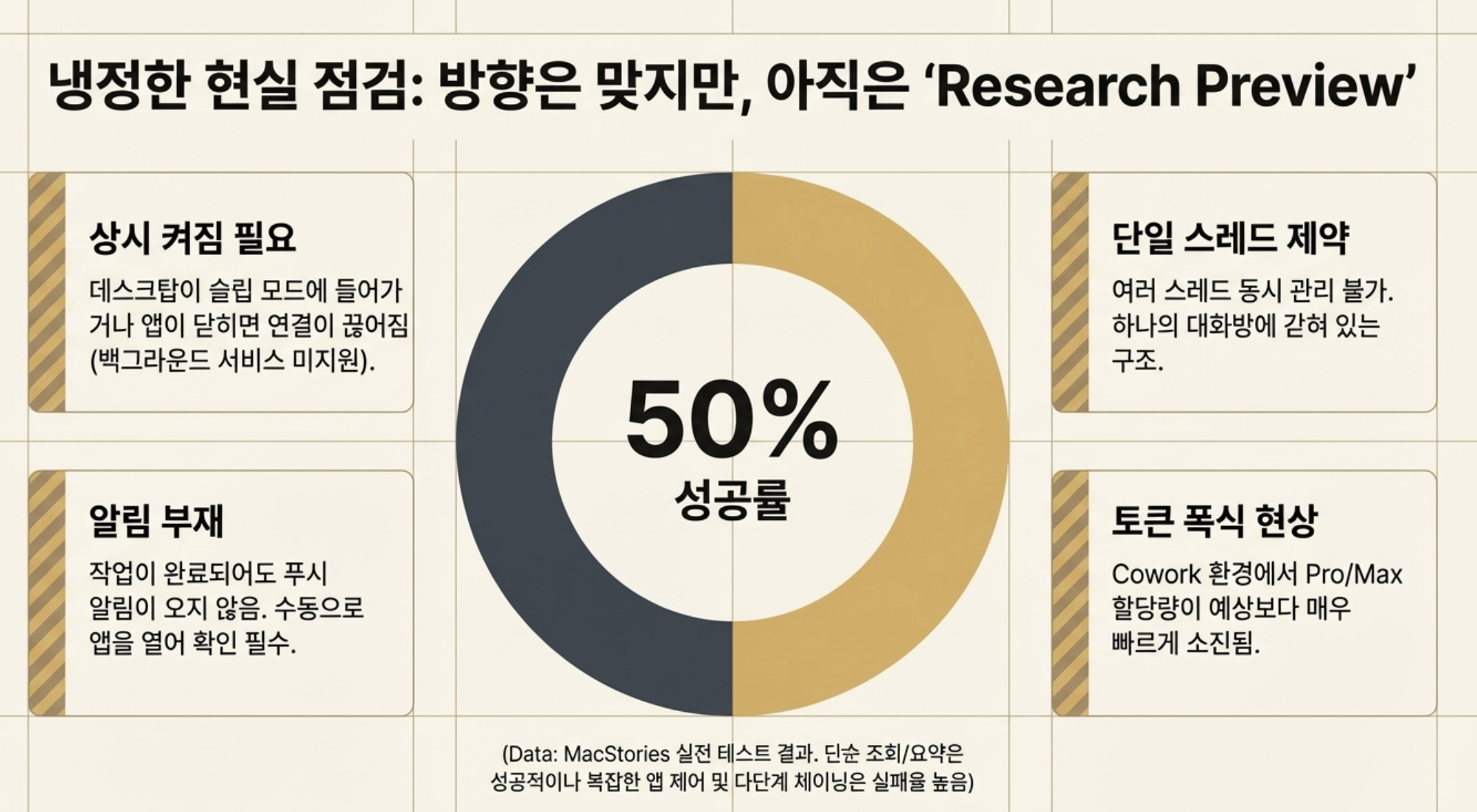 Dispatch는 아직 Research Preview다. MacStories 테스트 기준 성공률 ~50%에 알림도 없고 스레드도 하나뿐이다.