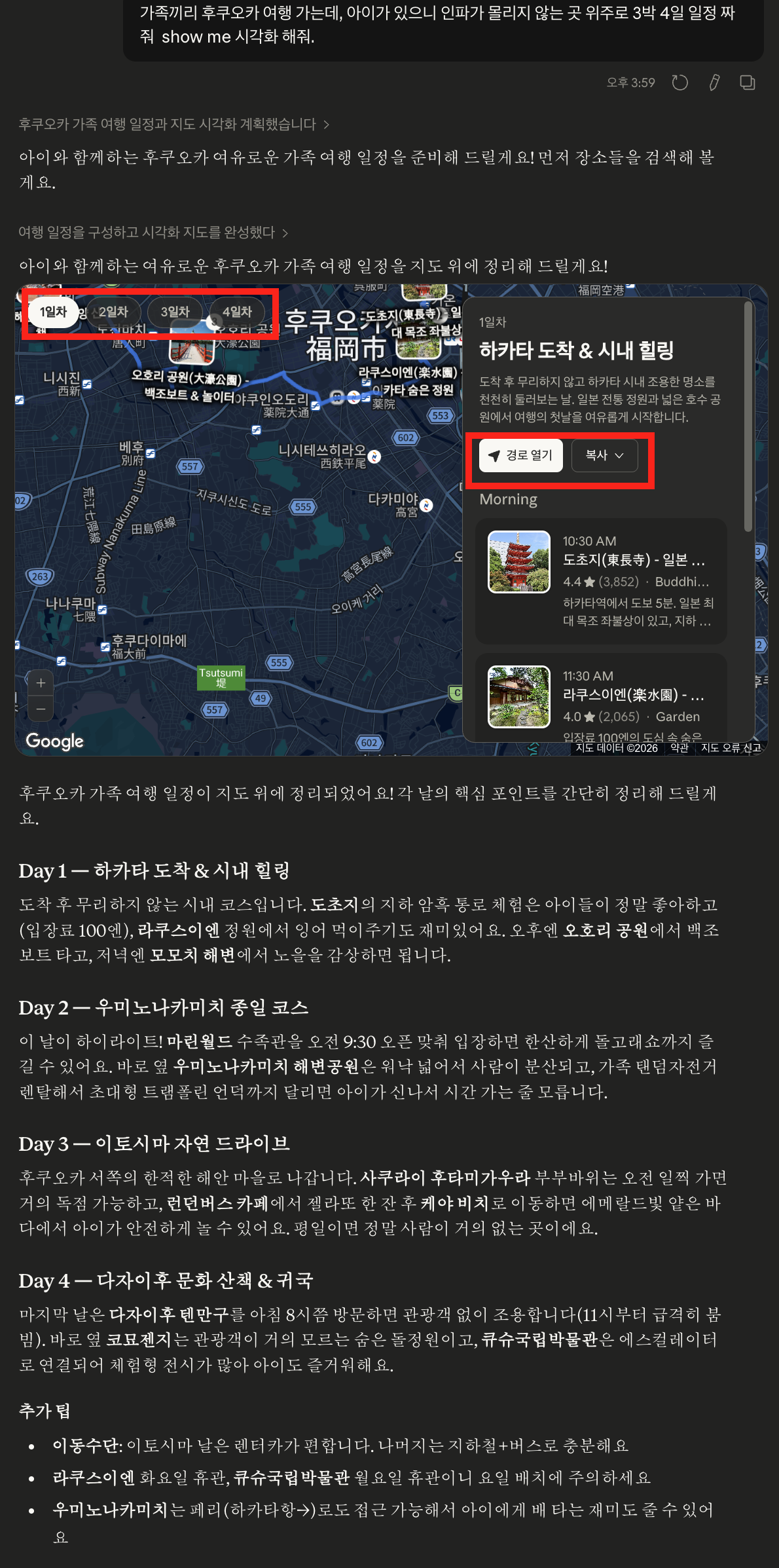 "후쿠오카 3박 4일, 아이 동반 가족여행 일정 짜줘"라고 요청했을 때:
