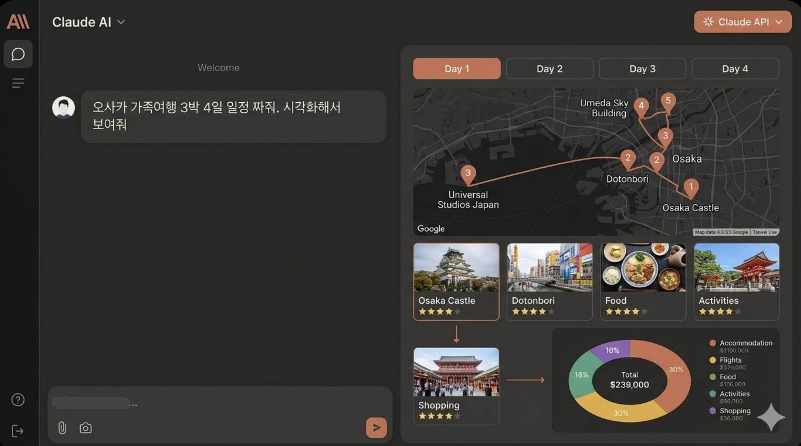 - 클로드: 일자별 탭 전환, 장소 카드에 아이 적합도 표시, 예산 시각화, 날씨 대비 대안까지 포함된 인터랙티브 시각화. 'Save as artifact' 후 퍼블리시하면 가족에게 링크로 공유 가능.
