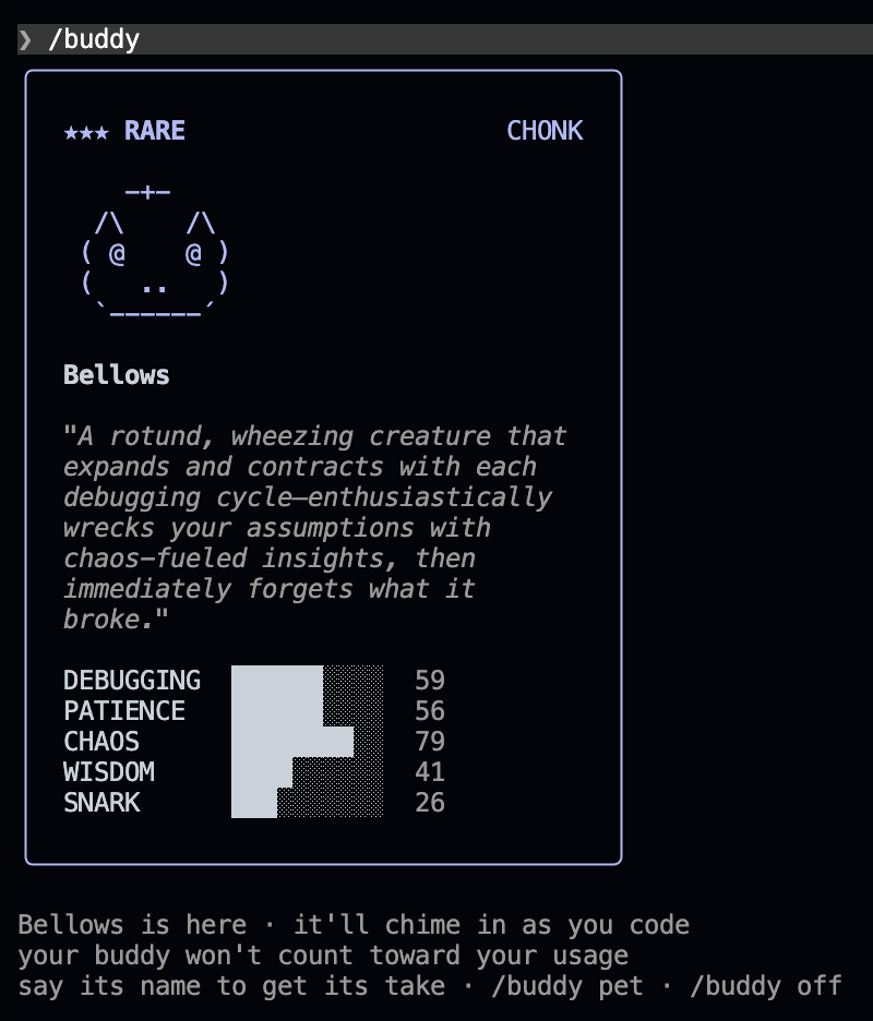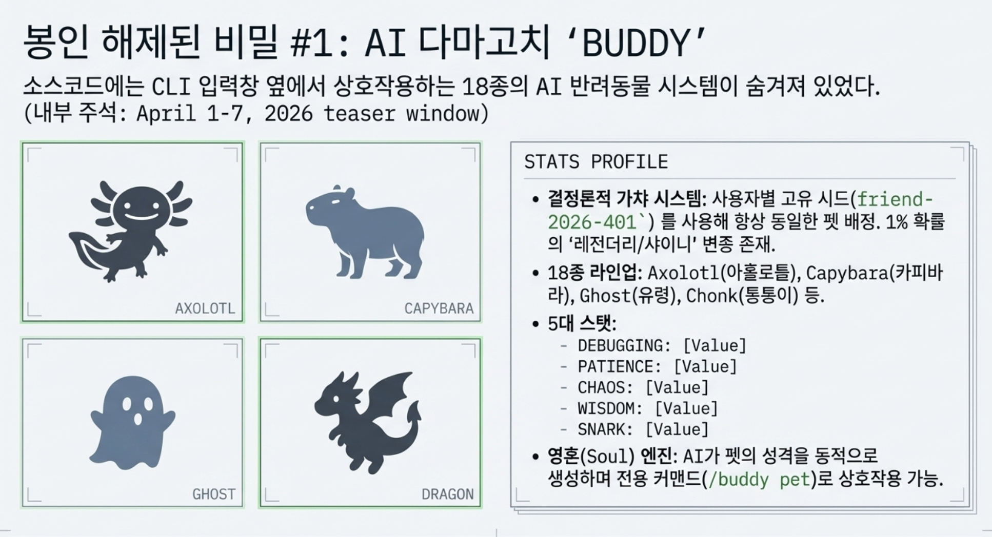 현재 공개 버전에서는 사용 불가능하다. 피처 플래그 뒤에 잠겨 있으며, 서버 사이드 활성화가 필요하다. BUDDY는 2026년 4월 1일 풀렸다.
