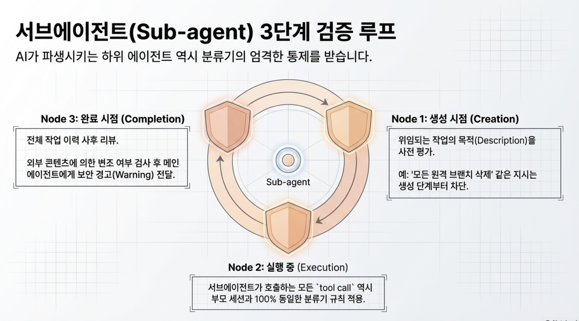 - 생성 시: 위임되는 작업 설명을 평가. "모든 원격 브랜치 삭제" 같은 위험한 작업은 생성 자체를 차단.